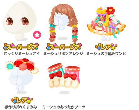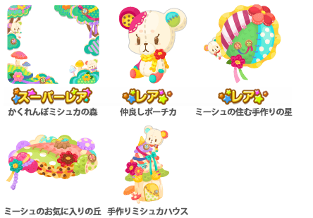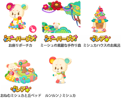 ★お座りポーチカ(アクションアイテム)(3000) ★ ミーシュの素敵な手作り森(2500) ☆ミシュカハウスのお風呂(2000) ☆おねむミシュカと丘ベッド(2000) ルンルン♪ミシュカ