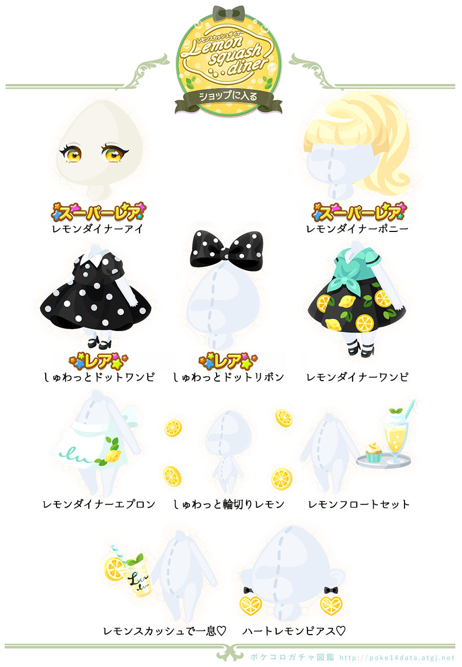 ★レモンダイナーアイ(3400)(顔パーツ) ★レモンダイナーポニー(3300) ☆しゅわっとドットワンピ(1500) ☆しゅわっとドットリボン(1300) レモンダイナーワンピ(1000) レモンダイナーエプロン(600) しゅわっと輪切りレモン(900) レモンフロートセット(500) レモンスカッシュで一息♡(700) ハートレモンピアス♡(500)