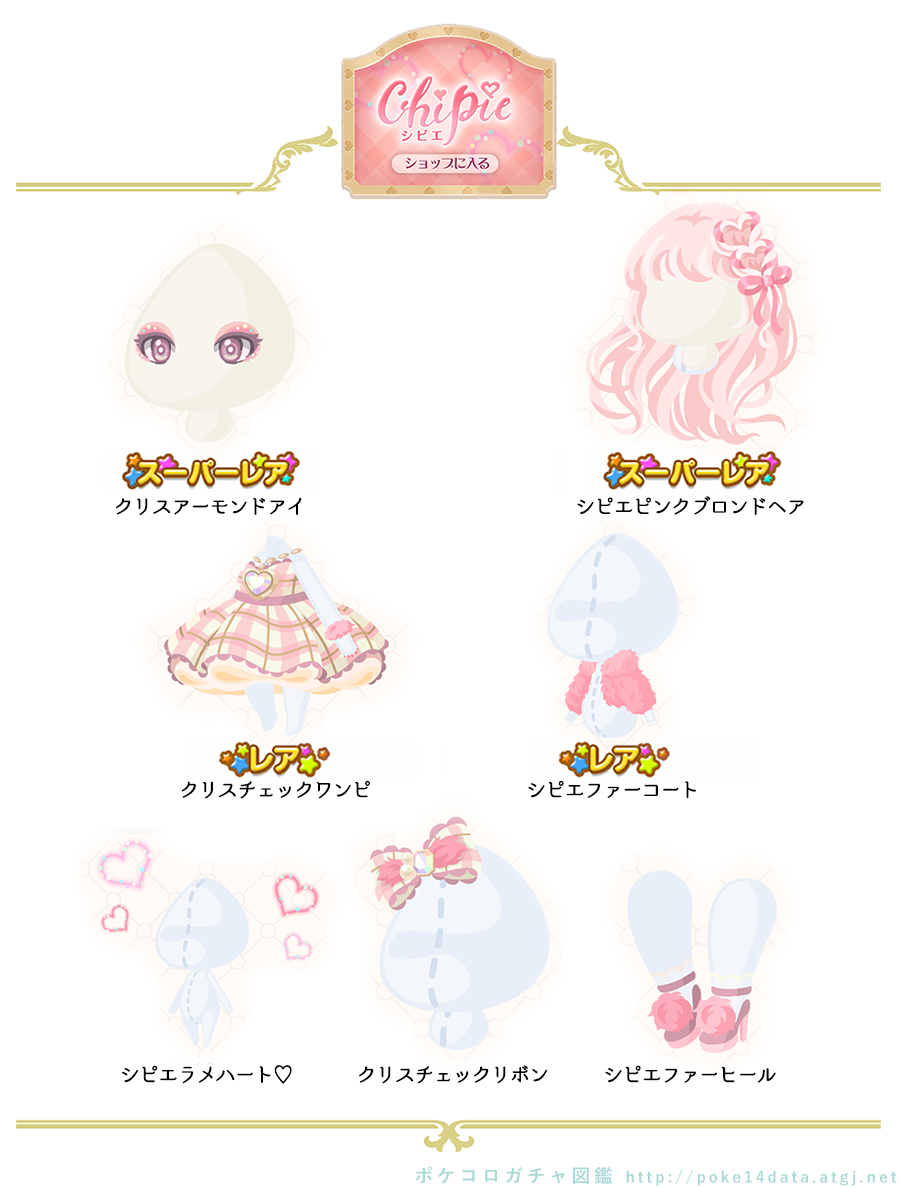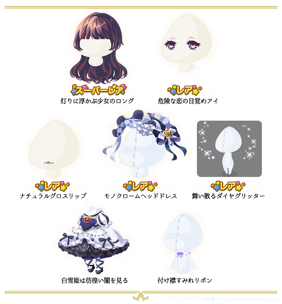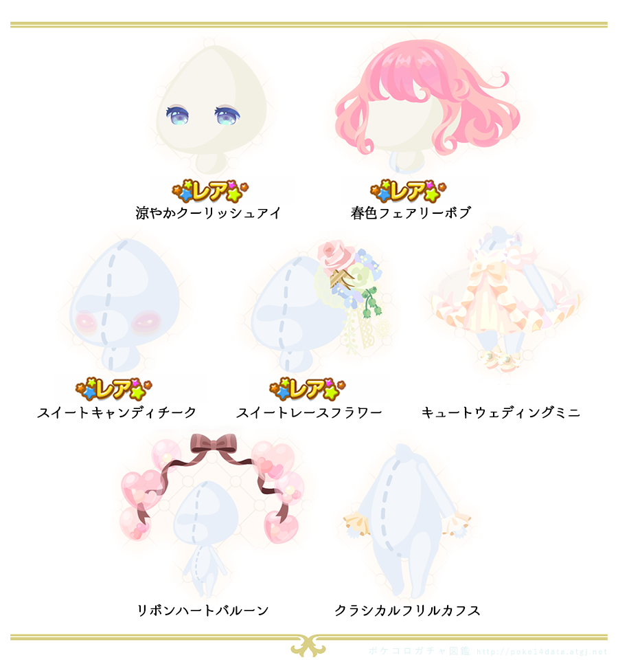 過去のガチャからピックアップ ・2016年8月 アイシクルアイスクリーム ・2016年4月フェアリーアカデミア ・2017年2月 スイートキャンディガール ・2013年9月 スイートフォレスト ・2014年5月 ジューンブライド ・2016年1月 ガールズ♥︎バレンタイン ・2016年12月 クラシカルロリータ