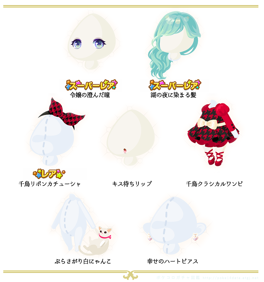 過去のガチャからピックアップ ・2016年10月 ハイカラ百貨店街 ・2017年12月 月明かりの白鳥 ・2014年12月 よそいき千鳥格子 ・2014年12月 ルミナスナイトデート ・2013年2月 特盛!にゃんこ ・2017年5月 ロマンティックブライド