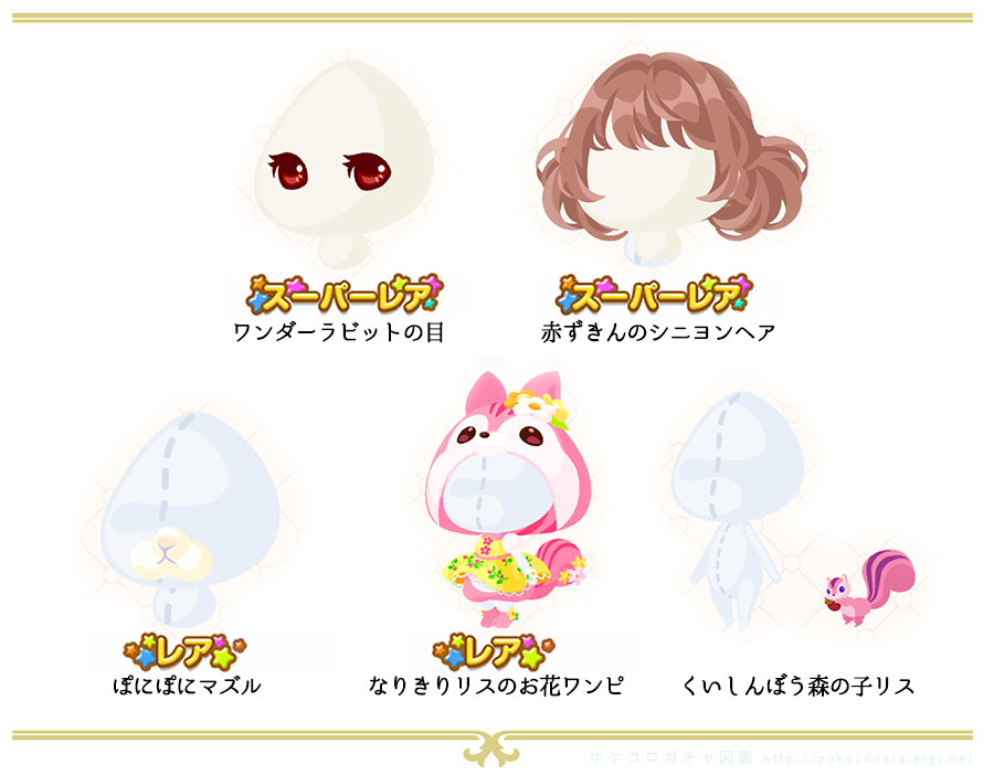過去のガチャからピックアップ ・2015年3月 ワンダーイースター ・2017年9月 刺しゅうのお花と赤ずきん ・2016年3月 イースターの国のアリス ・2015年4月 フラワーアニマル ・2014年8月 夏の夜の夢