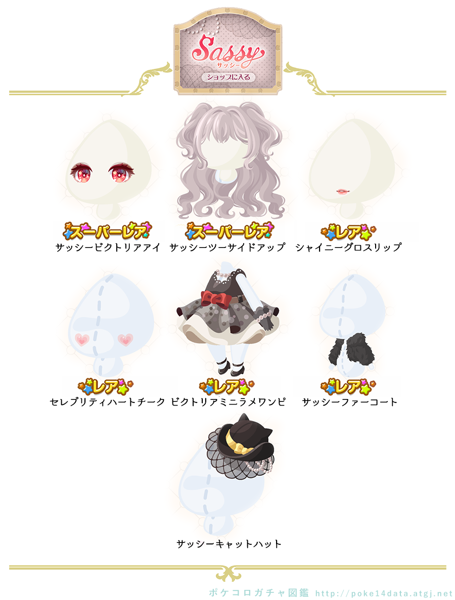 ★サッシービクトリアアイ(顔パーツ)(3700) ★サッシーツーサイドアップ(4000) ☆シャイニーグロスリップ(顔パーツ)(2500) ☆セレブリティハートチーク(2500) ☆ビクトリアミニラメワンピ(1300) ☆サッシーファーコート(1200) サッシーキャットハット(1000)