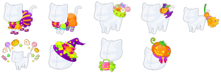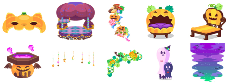 にゃーにゃーパンプキン 星空の天蓋 お菓子のステップ かぼちゃベッド パンプキンの椅子 魔法師のトイレ トリックチェーン おばけかぼちゃのツタ ★のびのびおばけ ハロウィンの夜