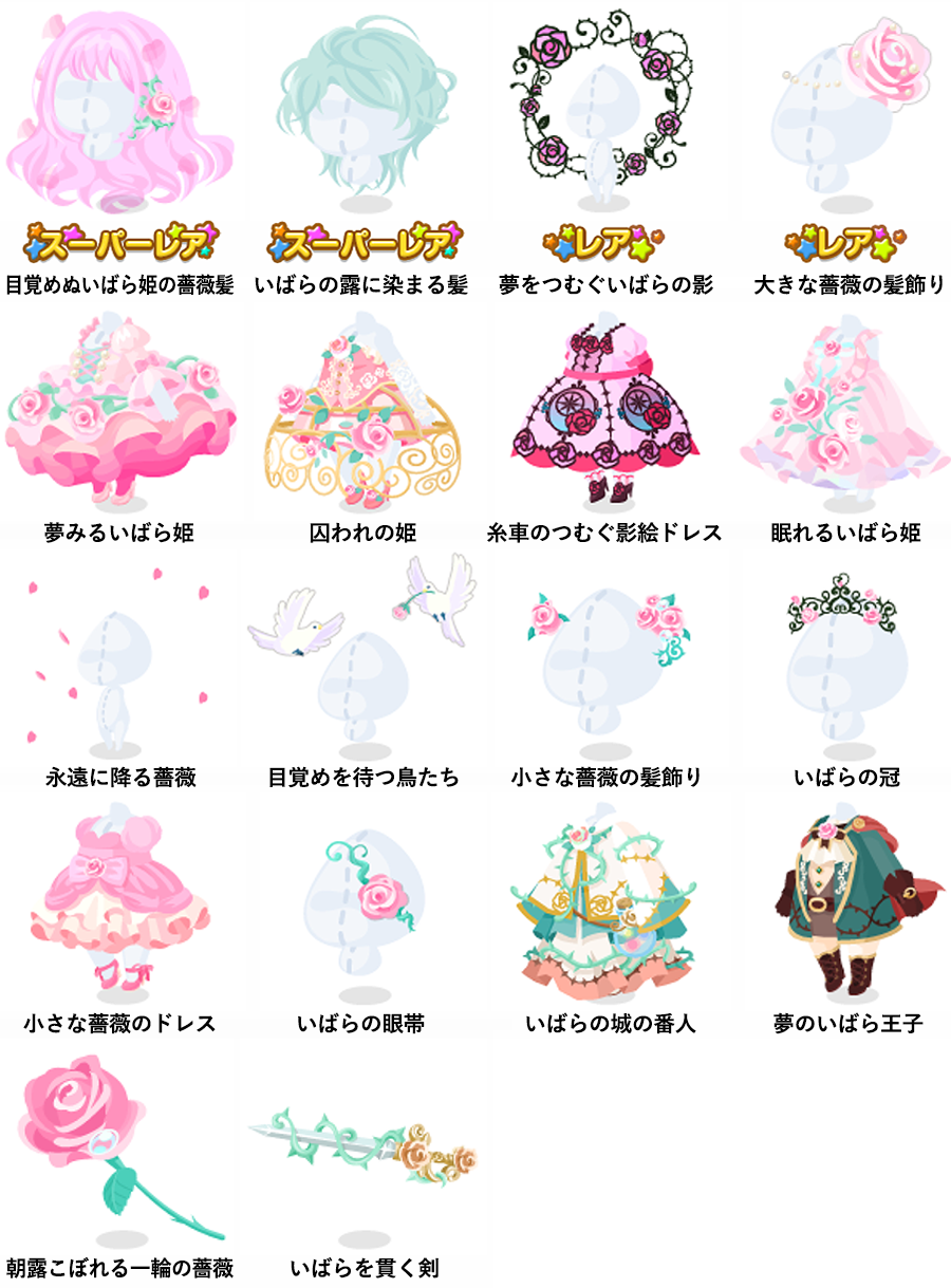 ★目覚めぬいばら姫の薔薇髪 ★いばらの露に染まる髪 ☆夢をつむぐいばらの影 ☆大きな薔薇の髪飾り 夢みるいばら姫 囚われの姫 糸車のつむぐ影絵ドレス 眠れるいばら姫 永遠に降る薔薇 目覚めを待つ鳥たち 小さな薔薇の髪飾り いばらの冠 小さな薔薇のドレス いばらの眼帯 いばらの城の番人 夢のいばら王子 朝露こぼれる一輪の薔薇 いばらを貫く剣