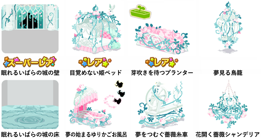 ★眠れるいばらの城の壁 ☆目覚めない姫ベッド ☆芽吹きを待つプランター 夢見る鳥籠 眠れるいばらの城の床 夢の始まるゆりかごお風呂 夢をつむぐ薔薇糸車 花開く薔薇シャンデリア