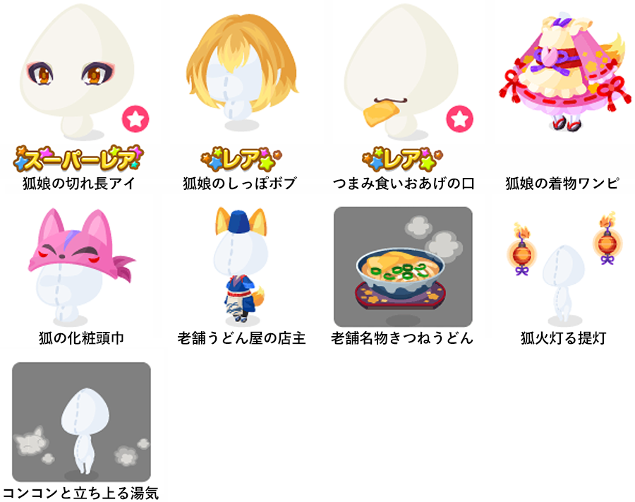 ★狐娘の切れ長アイ(顔パーツ) ☆狐娘のしっぽボブ ☆つまみ食いおあげの口(顔パーツ) 狐娘の着物ワンピ 狐の化粧頭巾 老舗うどん屋の店主 老舗名物きつねうどん 狐火灯る提灯 コンコンと立ち上る湯気