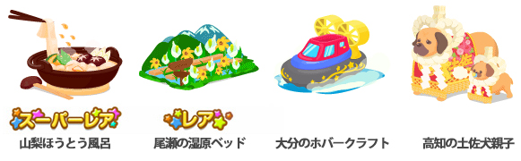 ★山梨ほうとう風呂 ☆尾瀬の湿原ベッド 大分のホバークラフト 高知の土佐犬親子