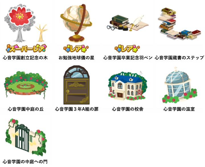 ★心音学園創立記念の木 No.220 学園特製フラワーティー心音学園記念樹の花 ☆お勉強地球儀の星 ☆心音学園卒業記念羽ペン 心音学園蔵書のステップ 心音学園中庭の丘 心音学園3年A組の扉 心音学園の校舎 心音学園の温室 心音学園の中庭への門