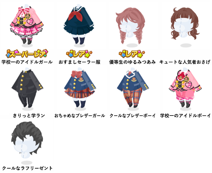 ★学校一のアイドルガール ☆おすましセーラー服 ☆優等生のゆるみつあみ キュートな人気者おさげ きりっと学ラン おちゃめなブレザーガール クールなブレザーボーイ 学校一のアイドルボーイ クールなラフリーゼント