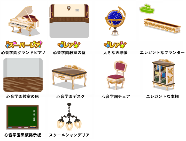 ★心音学園グランドピアノ ☆心音学園教室の壁 ☆大きな天球儀 エレガントなプランター 心音学園教室の床 心音学園デスク 心音学園チェア エレガントな本棚 心音学園黒板掲示板 スクールシャンデリア