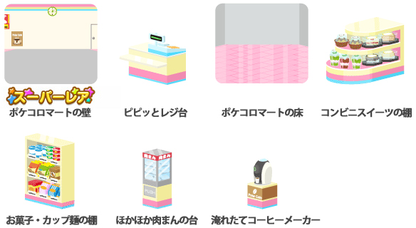 ★ポケコロマートの壁 ピピッとレジ台 ポケコロマートの床 コンビニスイーツの棚 お菓子・カップ麺の棚 ほかほか肉まんの台 淹れたてコーヒーメーカー