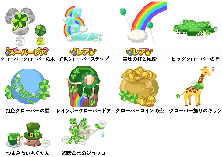 ★クローバークローバーの木 No.219 クローバー天ぷらクローバークローバーの実 ☆虹色クローバーステップ ☆幸せの虹と風船 ビッグクローバーの丘 虹色クローバーの星 レインボークローバードア クローバーコインの壺 クローバー飾りのキリン つまみ食いもぐたん 綺麗な水のジョウロ