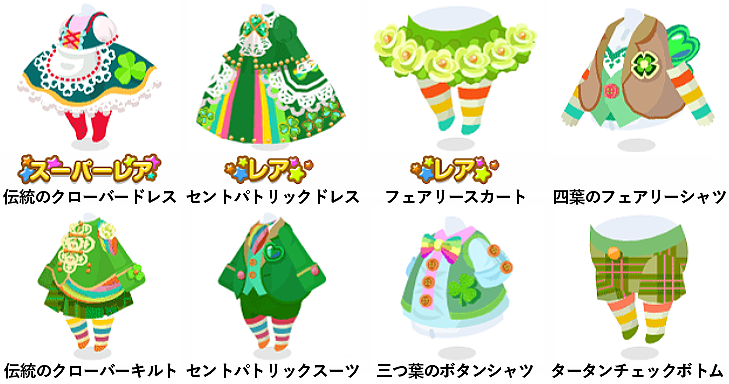 【イベントで復刻】 ・2017.11.15〜11.23 『バスタイムマシン あふれる食欲の秋』 ・2018.02.15〜02.22 『バスタイムマシン〜健康一番研究二番〜』 ・2018.08.28〜09.03 『バスタイムマシン〜残暑お見舞い申し上げます〜』 ・2023.04.06〜2023.04.19 『バスタイムマシン〜幸せのクローバー探しだぶ〜』 【ピックアップガチャで復刻】 ・2019.06.08〜2019.06.09 『ロックフェス』 ( シャムロックチェア・シャムロックファウンテン・シャムロックバルーン シャムロックミニハットのみ復刻)