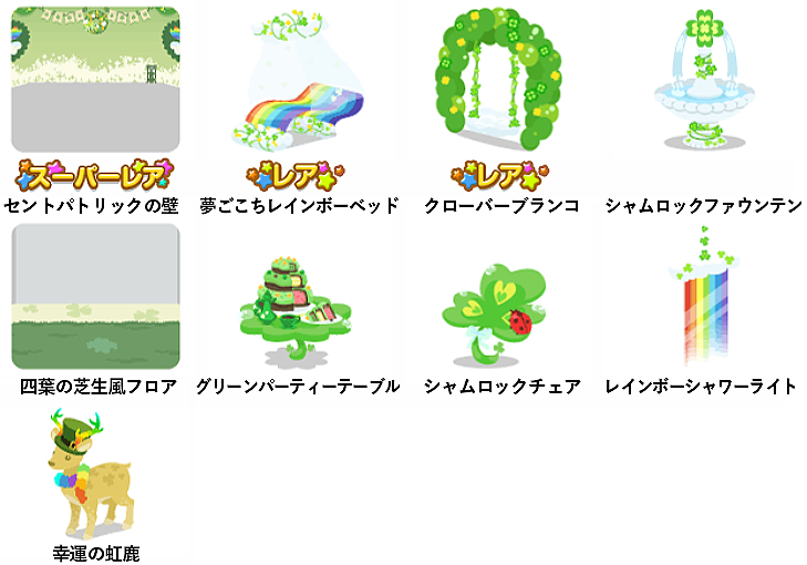 ★セントパトリックの壁 ☆夢ごこちレインボーベッド ☆クローバーブランコ シャムロックファウンテン 四葉の芝生風フロア グリーンパーティーテーブル シャムロックチェア レインボーシャワーライト 幸運の虹鹿