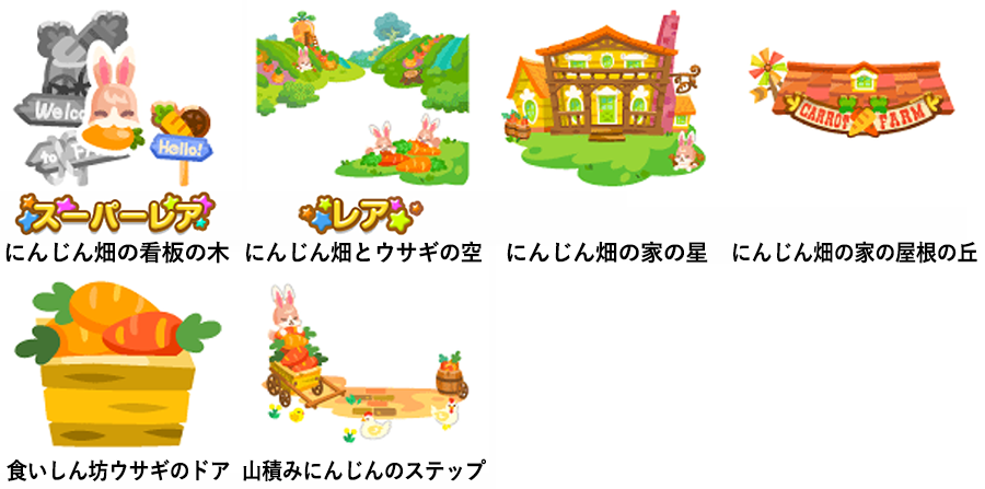 ★にんじん畑の看板の木 No.1151 畑の手押し車チャーハン にんじん畑のウサギの実 ☆にんじん畑とウサギの空 にんじん畑の家の星 にんじん畑の家の屋根の丘 食いしん坊ウサギのドア 山積みにんじんのステップ
