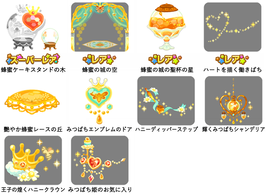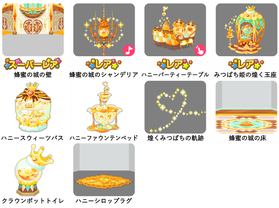 ★蜂蜜の城の壁 ☆蜂蜜の城のシャンデリア(ネイロアイテム) ☆ハニーパーティーテーブル(アクションアイテム) ☆みつばち姫の煌く玉座 ハニースウィーツバス ハニーファウンテンベッド 煌くみつばちの軌跡 蜂蜜の城の床 クラウンポットトイレ ハニーシロップラグ