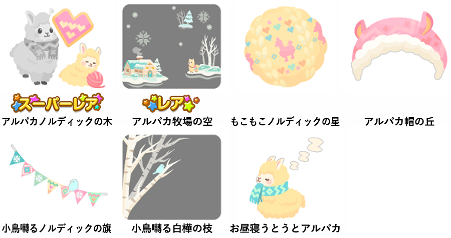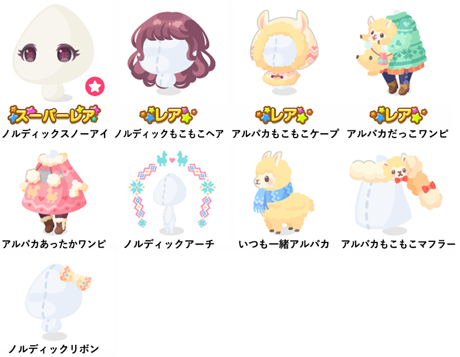 ★ノルディックスノーアイ(顔パーツ) ☆ノルディックもこもこヘア ☆アルパカもこもこケープ ☆アルパカだっこワンピ アルパカあったかワンピ ノルディックアーチ いつも一緒アルパカ アルパカもこもこマフラー ノルディックリボン
