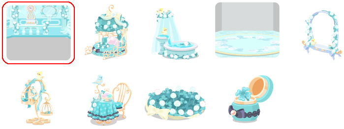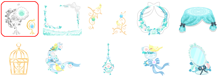 ★イノセントクローバーの壁 ☆イノセントケージベッド ☆水浴びインコのお風呂 イノセントクローバーの床 寄り添いインコブランコ 金のバードケージ イノセントカフェテーブル シロツメクサの花畑 クローバーリングトイレ