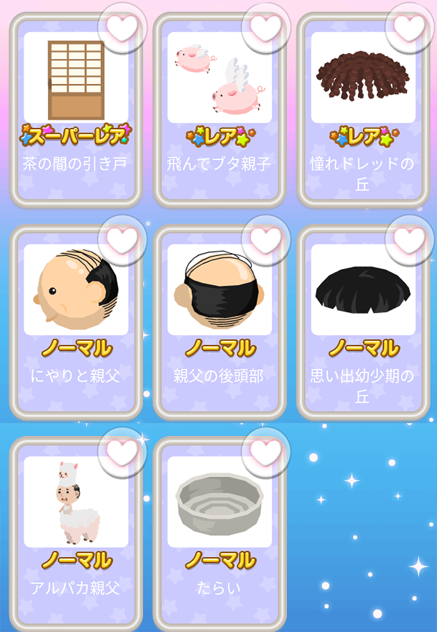 ★茶の間の引き戸 ☆飛んでブタ親子 ☆憧れドレッドの丘 にやりと親父 親父の後頭部 思い出幼少期の丘 アルパカ親父 たらい