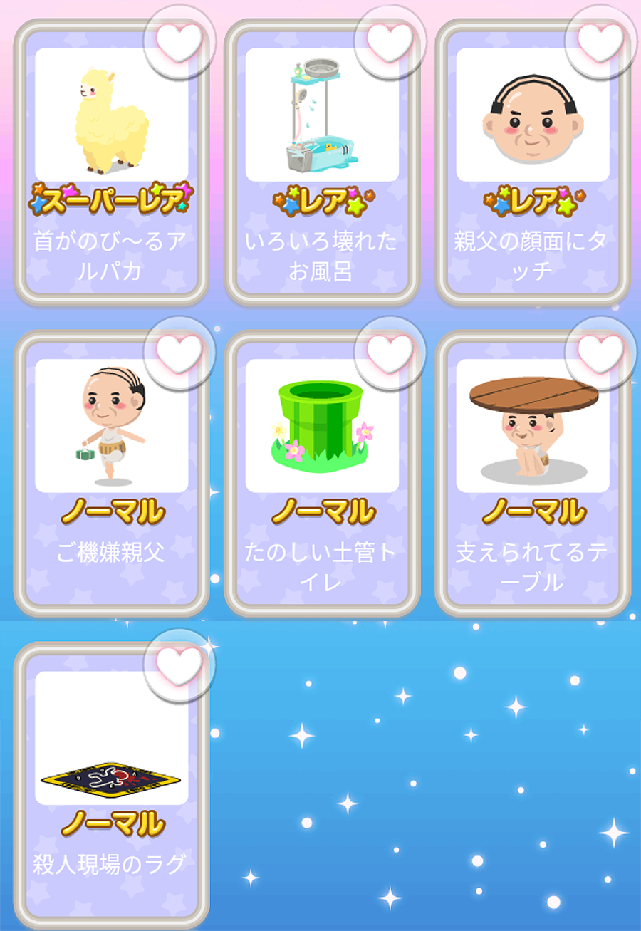 ★首がのび〜るアルパカ ☆いろいろ壊れたお風呂 ☆親父の顔面にタッチ ご機嫌親父 たのしい土管トイレ 支えられているテーブル 殺人現場のラグ