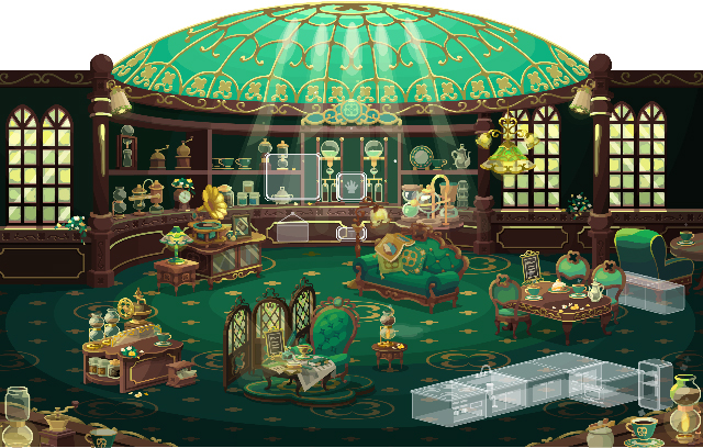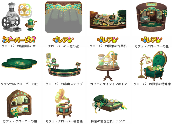 ★カフェ・クローバーの壁 ☆探偵はクローバーにて(ネイロアイテム) ☆探偵のお気に入りの椅子(アクションアイテム) ☆クローバーカウンター風呂 カフェ・クローバーの床 クローバーソファのベッド クローバーの客席テーブル カフェのサイフォントイレ クローバーランプシェード