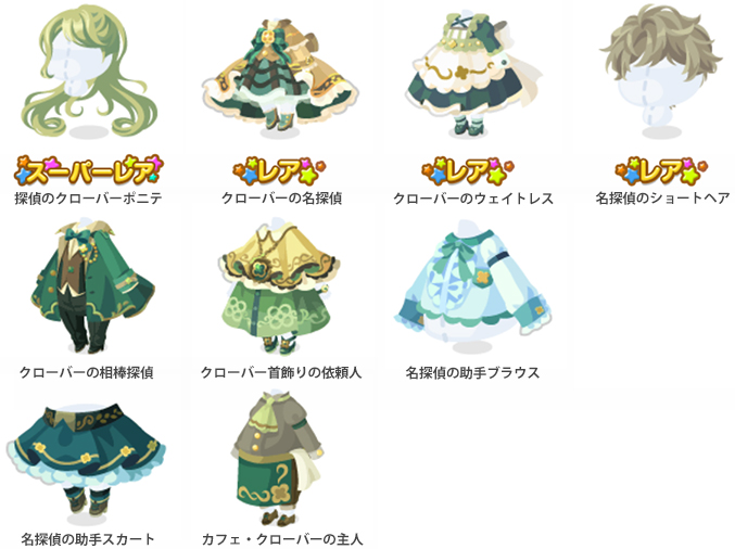 ★探偵のクローバーポニテ ☆クローバーの名探偵 ☆クローバーのウェイトレス ☆名探偵のショートヘア クローバーの相棒探偵 クローバー首飾りの依頼人 名探偵の助手ブラウス 名探偵の助手スカート カフェ・クローバーの主人