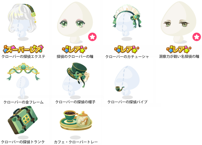 ★クローバーの探偵エクステ ☆探偵のクローバーの瞳(顔パーツ) ☆クローバーのカチューシャ ☆洞察力が鋭い名探偵の瞳(顔パーツ) クローバーの金フレーム クローバーの探偵の帽子 クローバーの探偵パイプ クローバーの探偵トランク カフェ・クローバートレー