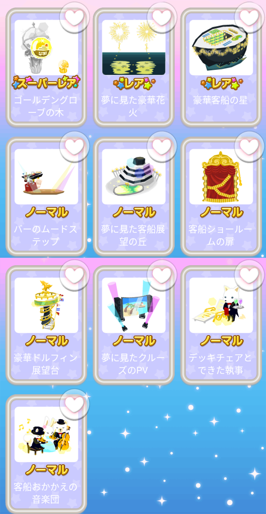 ★ゴールデングローブの木 No.313 豪華フカヒレ客船ゴールデングローブの実 ☆夢に見た豪華花火 ☆豪華客船の星 バーのムードステップ 夢に見た客船展望の丘 客船ショールームの扉 豪華ドルフィン展望台 夢に見たクルーズのPV デッキチェアとできた執事 客船おかかえの音楽団