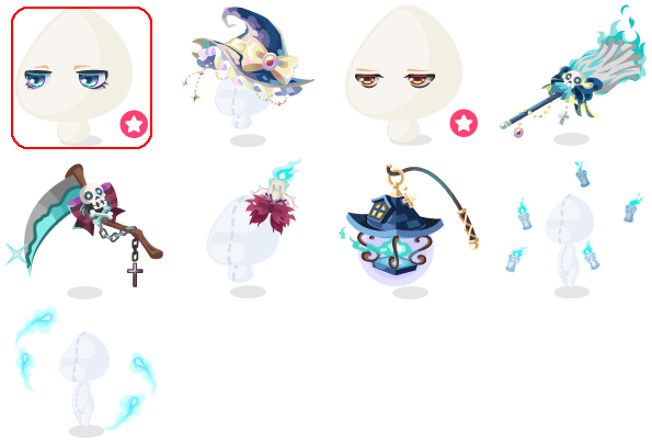 ★ゴーストウィッチアイ(顔パーツ) ☆東の魔女の帽子 ☆魔女の怪しい眼差し(顔パーツ) ☆ゴースト宿る魔女箒 怪しく光る死神の鎌 魂灯る蝋燭リボン ゴーストハウスランプ 魂灯る蝋燭の輪 浮遊するゴースト