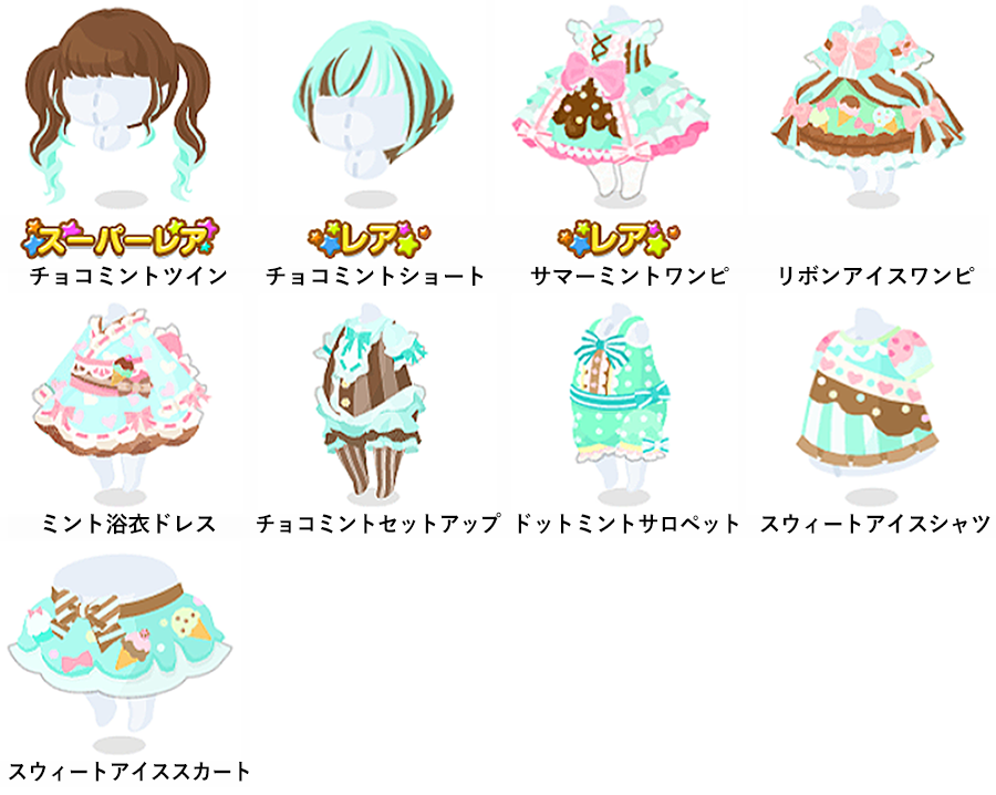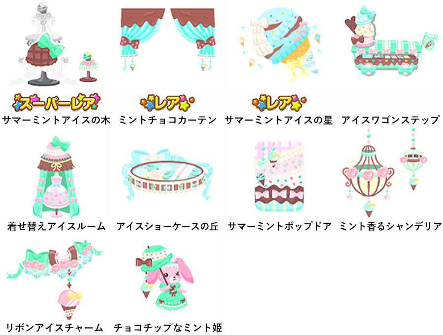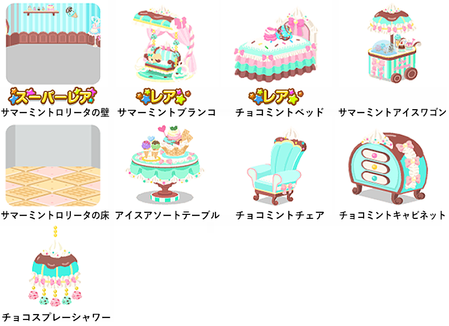 ★サマーミントロリータの壁 ☆サマーミントブランコ ☆チョコミントベッド サマーミントアイスワゴン サマーミントロリータの床 アイスアソートテーブル チョコミントチェア チョコミントキャビネット チョコスプレーシャワー