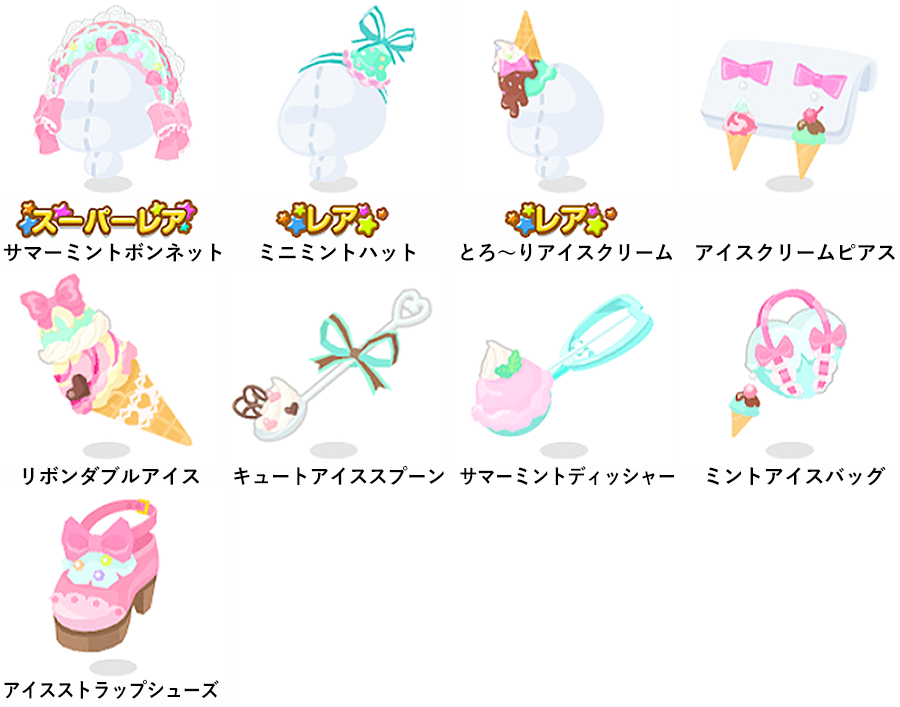 ★サマーミントボンネット ☆ミニミントハット ☆とろ~りアイスクリーム アイスクリームピアス リボンダブルアイス キュートアイススプーン サマーミントディッシャー ミントアイスバッグ アイスストラップシューズ
