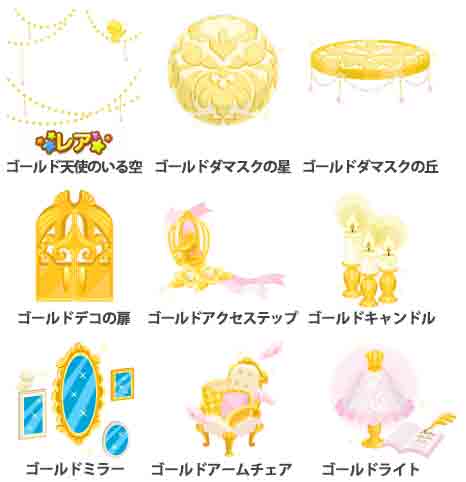 ☆ゴールド天使のいる空 ゴールドダマスクの星 ゴールドダマスクの丘 ゴールドデコの扉 ゴールドアクセステップ ゴールドキャンドル ゴールドミラー ゴールドアームチェア ゴールドライト