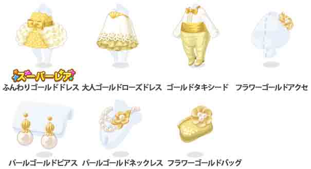 ★ふんわりゴールドドレス 大人ゴールドローズドレス ゴールドタキシード フラワーゴールドアクセ パールゴールドピアス パールゴールドネックレス フラワーゴールドバッグ