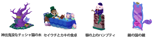 神出鬼没なチェシャ猫の木 セイウチとカキの食卓 塀の上のハンプティ 鏡の国の鏡