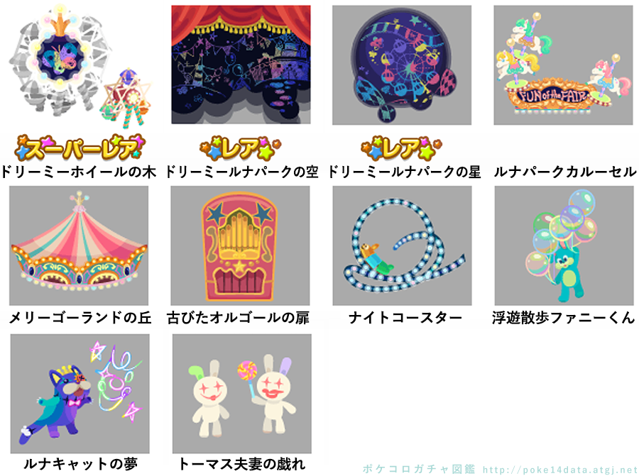 ★ドリーミーホイールの木 No.394 ドリーミールナシェイクドリーミーホイールの実 ☆ドリーミールナパークの空 ☆ドリーミールナパークの星 ルナパークカルーセル メリーゴーランドの丘 古びたオルゴールの扉 ナイトコースター 浮遊散歩ファニーくん ルナキャットの夢 トーマス夫妻の戯れ