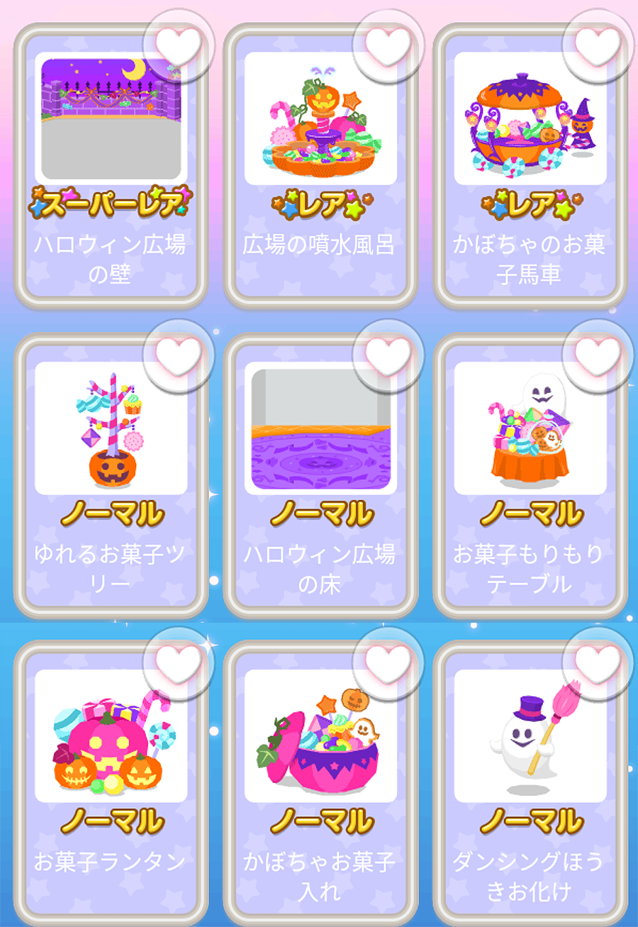 ★ハロウィン広場の壁 ☆広場の噴水風呂 ☆かぼちゃのお菓子馬車 ゆれるお菓子ツリー ハロウィン広場の床 お菓子もりもりテーブル お菓子ランタン かぼちゃお菓子入れ ダンシングほうきお化け