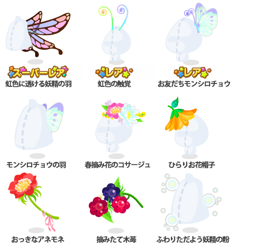 ★虹色に透ける妖精の羽 ☆虹色の触覚 ☆お友だちモンシロチョウ モンシロチョウの羽 春摘み花のコサージュ ひらりお花帽子 おっきなアネモネ 摘みたて木苺 ふわりただよう妖精の粉