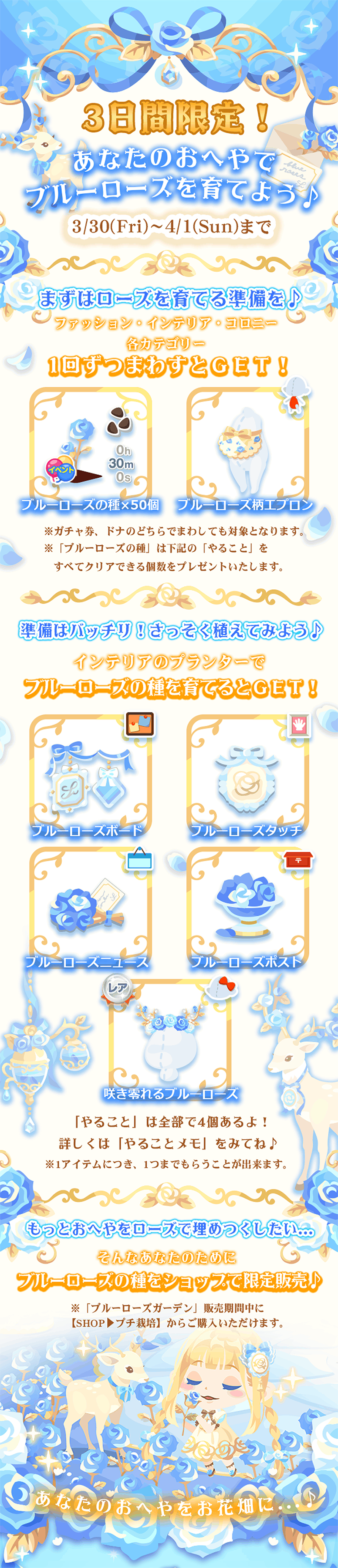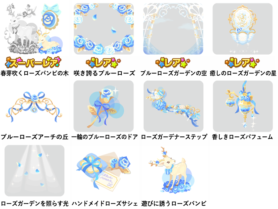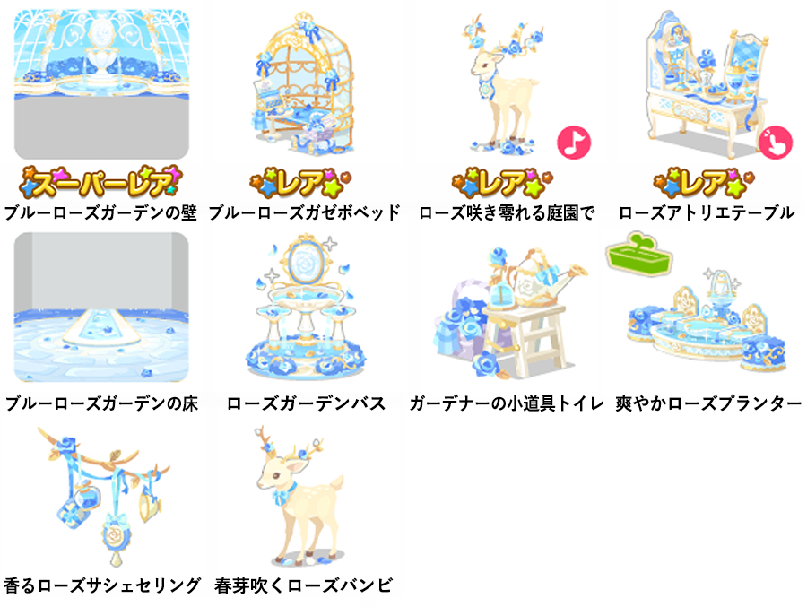 ★ブルーローズガーデンの壁 ☆ブルーローズガゼボベッド ☆ローズ咲き零れる庭園で(ネイロアイテム) ☆ローズアトリエテーブル(アクションアイテム) ブルーローズガーデンの床 ローズガーデンバス ガーデナーの小道具トイレ 爽やかローズプランター 香るローズサシェセリング 春芽吹くローズバンビ