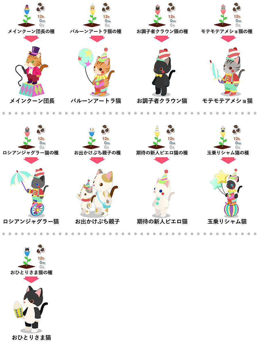 メインクーン団長の種 → メインクーン団長 バルーンアートラ猫の種 → バルーンアートラ猫 お調子者クラウン猫の種 → お調子者クラウン猫 モテモテアメショ猫の種 → モテモテアメショ猫 ロシアンジャグラー猫の種 → ロシアンジャグラー猫 お出かけぶち親子の種 → お出かけぶち親子 期待の新人ピエロ猫の種 → 期待の新人ピエロ猫 玉乗りシャム猫の種 → 玉乗りシャム猫 おひとりさま猫の種 → おひとりさま猫