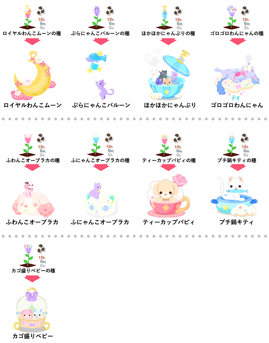 ロイヤルわんこムーンの種 → ロイヤルわんこムーン ぷらにゃんこバルーンの種 → ぷらにゃんこバルーン ほかほかにゃんぶりの種 → ほかほかにゃんぶり ゴロゴロわんにゃんの種 → ゴロゴロわんにゃん ふわんこオーブラカの種 → ふわんこオーブラカ ふにゃんこオーブラカの種 → ふにゃんこオーブラカ ティーカップパピィの種 → ティーカップパピィ プチ鍋キティの種 → プチ鍋キティ カゴ盛りベビーの種 → カゴ盛りベビー