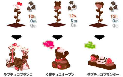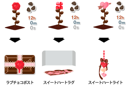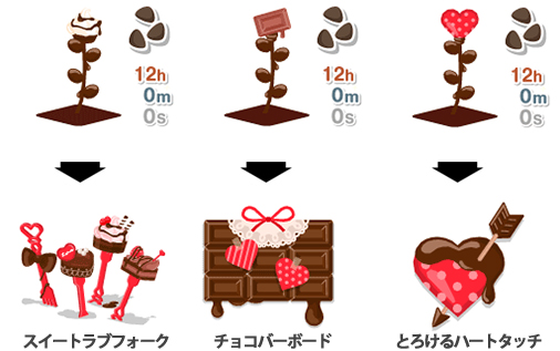 ★ラブチョコブランコの種 → ラブチョコブランコ くまチョコオーブンの種 → くまチョコオーブン ラブチョコプランターの種 → ラブチョコプランター スイートラブフォークの種 → スイートラブフォーク チョコバーボードの種 → チョコバーボード とろけるハートタッチの種 → とろけるハートタッチ ラブチョコポストの種 → ラブチョコポスト スイートハートラグの種 → スイートハートラグ スイートハートライトの種 → スイートハートライト