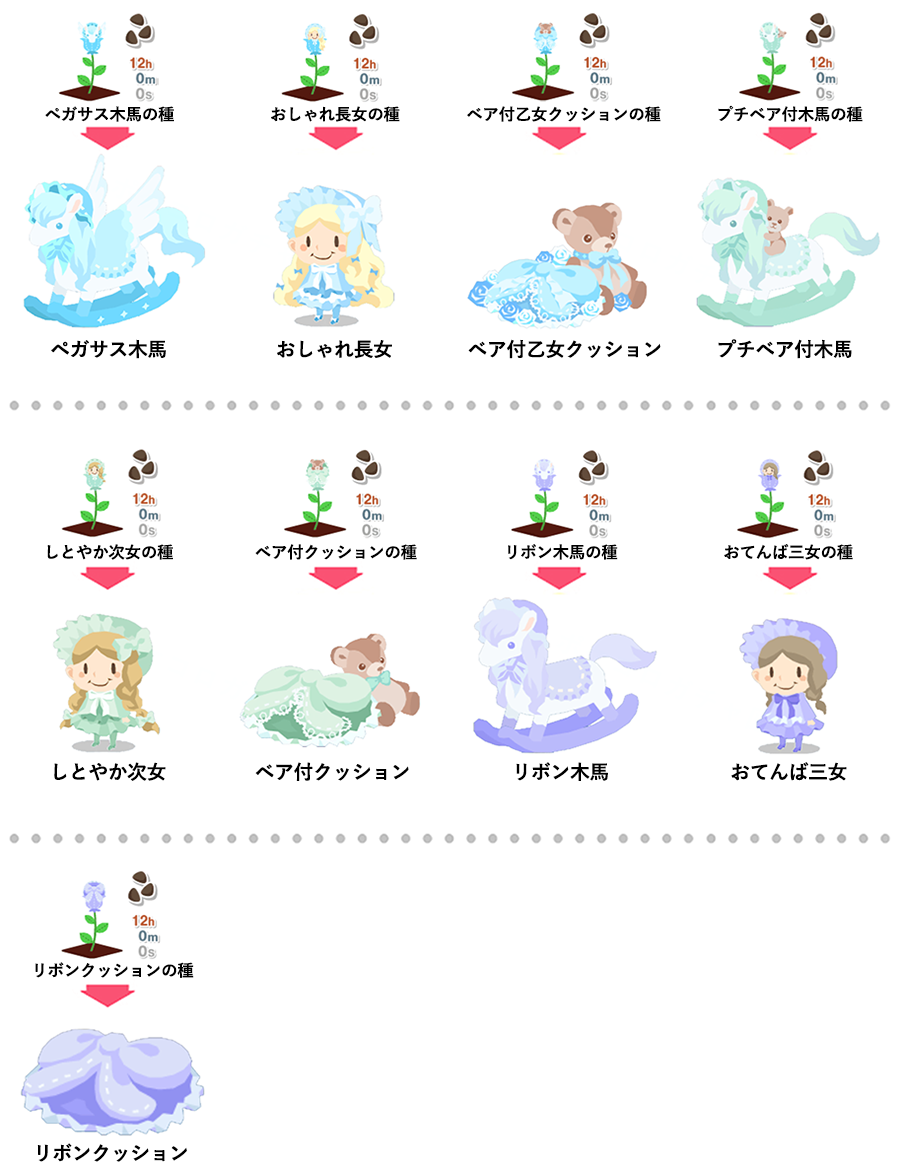 ペガサス木馬の種 → ペガサス木馬 おしゃれ長女の種 → おしゃれ長女 ベア付乙女クッションの種 → ベア付乙女クッション プチベア付木馬の種 → プチベア付木馬 しとやか次女の種 → しとやか次女 ベア付クッションの種 → ベア付クッション リボン木馬の種 → リボン木馬 おてんば三女の種 → おてんば三女 リボンクッションの種 → リボンクッション