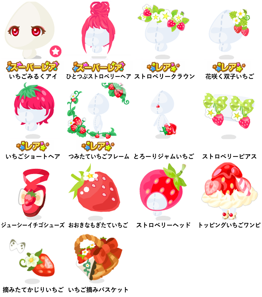 ★いちごみるくアイ(顔パーツ) ★ひとつぶストロベリーヘア ☆ストロベリークラウン ☆花咲く双子いちご ☆いちごショートヘア ☆つみたていちごフレーム とろーりジャムいちご ストロベリーピアス ジューシーイチゴシューズ おおきなもぎたていちご ストロベリーヘッド トッピングいちごワンピ 摘みたてかじりいちご いちご摘みバスケット