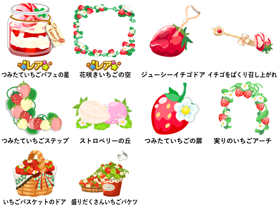 ☆つみたていちごパフェの星 ☆花咲きいちごの空 ジューシーイチゴドア イチゴをぱくり召し上がれ つみたていちごステップ ストロベリーの丘 つみたていちごの扉 実りのいちごアーチ いちごバスケットのドア 盛りだくさんいちごバケツ
