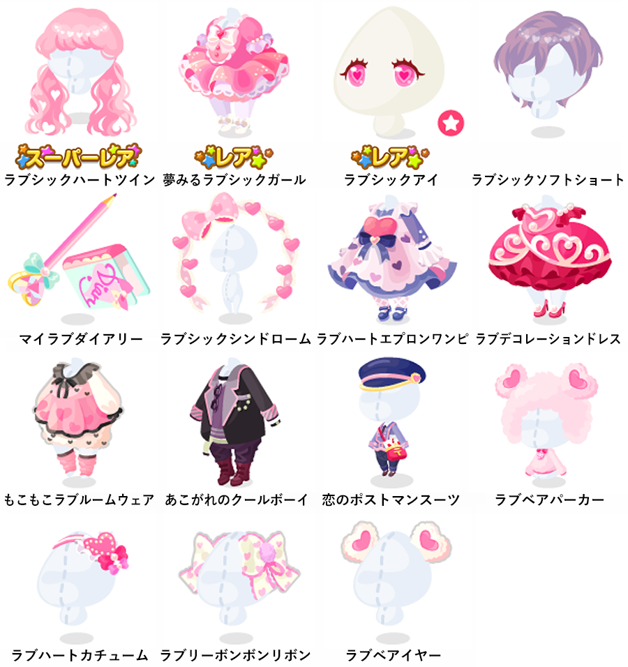 ★ラブシックハートツイン ☆夢みるラブシックガール ☆ラブシックアイ(顔パーツ) ラブシックソフトショート マイラブダイアリー ラブシックシンドローム ラブハートエプロンワンピ ラブデコレーションドレス もこもこラブルームウェア あこがれのクールボーイ 恋のポストマンスーツ ラブベアパーカー ラブハートカチューム ラブリーボンボンリボン ラブベアイヤー