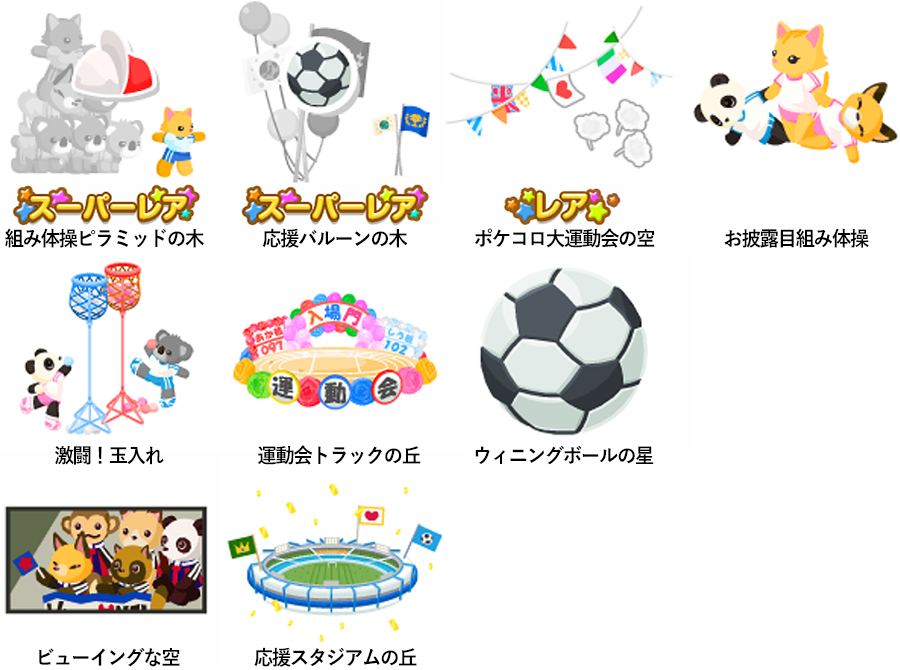 ★組み体操ピラミッドの木 No.445 目指せ優勝紅白弁当名物赤白帽の実 ★応援バルーンの木 No.396 絶対に勝つドン! ウィニングボールバルーンの実 ☆ポケコロ大運動会の空 お披露目組み体操 激闘!玉入れ 運動会トラックの丘 ウィニングボールの星 ビューイングな空 応援スタジアムの丘