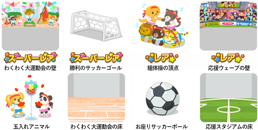 ★わくわく大運動会の壁 ★勝利のサッカーゴール ☆組体操の頂点 ☆応援ウェーブの壁 玉入れアニマル わくわく大運動会の床 お座りサッカーボール 応援スタジアムの床