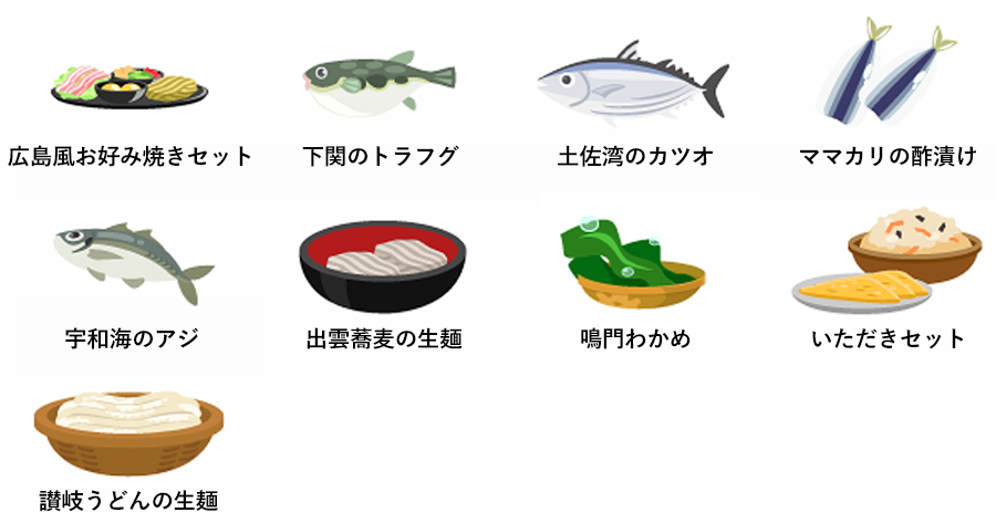 広島風お好み焼きセットNo.703 広島風お好み焼き    下関のトラフグNo.704 山口フグ刺し    土佐湾のカツオNo.708 高知カツオのたたき    ママカリの酢漬けNo.702 岡山ままかり寿司    宇和海のアジNo.707 愛媛ひゅうが飯    出雲蕎麦の生麺No.701 島根出雲そば    鳴門わかめNo.705 徳島鳴門わかめうどん    いただきセットNo.700 鳥取いただき    讃岐うどんの生麺No.706 香川讃岐うどん