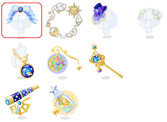 ★星宿るロマネスクリボン ☆不思議な天球図 ☆星降るベールのミニハット こぼれおちた星の欠片飾り 星映す懐中宇宙 星くずきらめく天体ランプ 太陽と月めぐる天体杖 きらめく天体望遠鏡 星くずを閉じ込めた瓶