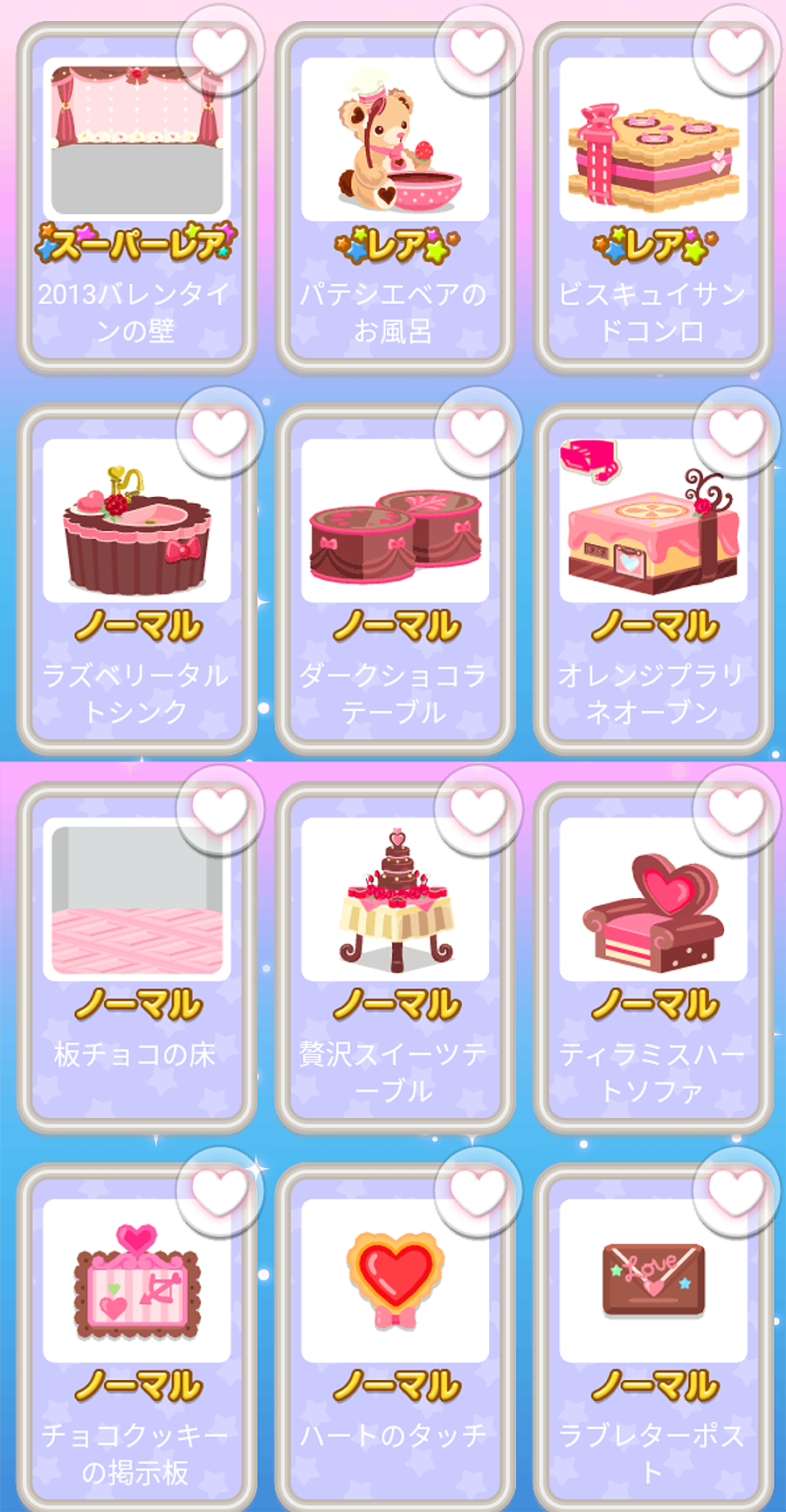 ★2013バレンタインの壁 ☆パテシエベアのお風呂 ☆ビスキュイサンドコンロ ラズベリータルトシンク ダークショコラテーブル オレンジプラリネオーブン 板チョコの床 贅沢スイーツテーブル ティラミスハートソファ チョコクッキーの掲示板 ハートのタッチ ラブレターポスト